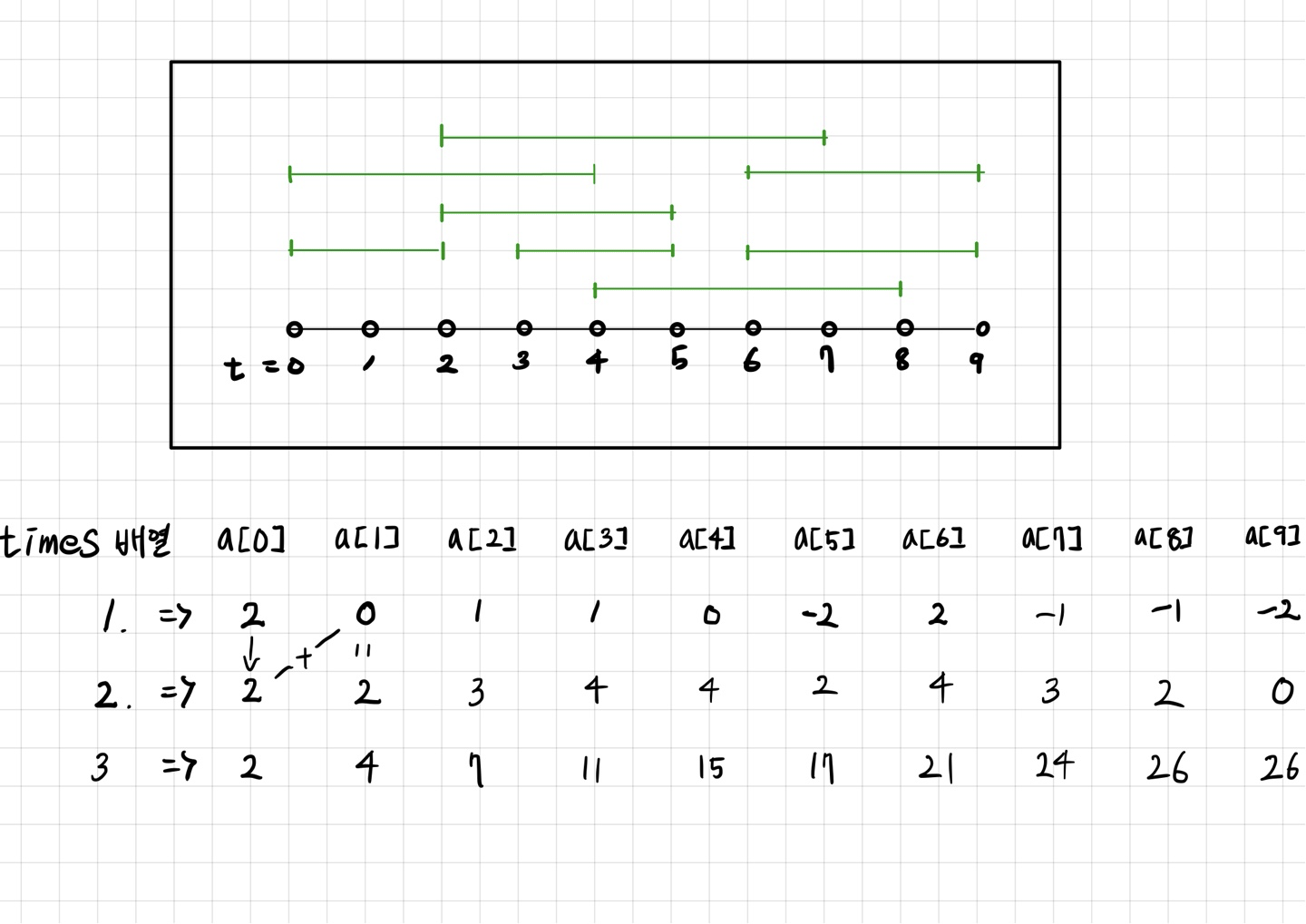 4. times배열을 times[i] = i 시점부터 i+1시점 까지의 구간을 포함하는 재생된 구간의 개수로 재정의한다.