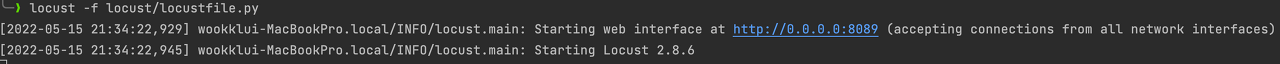 locust -f your/path/locustfile.py # 현재 위치에 locustfile.py 라는 파일이 존재하면 locust # --host 등 커맨드 옵션을 알고 싶다면 locust --help정상적으로 스크립트를 작성했다면 아래의 출력과 함께 실행된다.